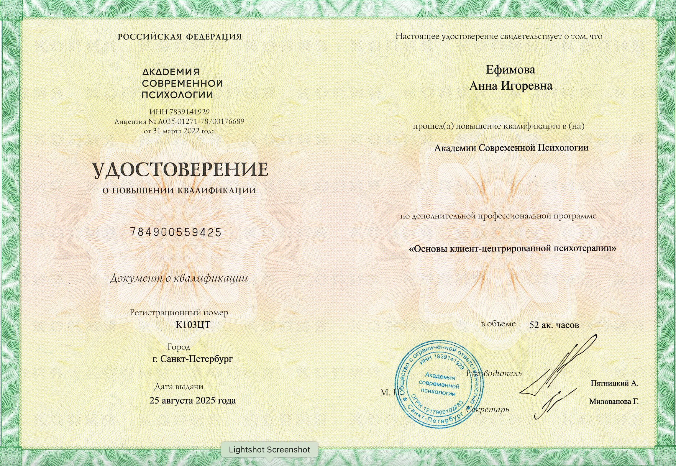 Психология - часть моего поиска. Сейчас я учусь в "Психодемии" на курсе "Мастерство психологического консультирования", разделяю взгляды Александра Колмановского и Карла Роджерса, в планах - освоение КПТ и одного из гуманистических подходов. Мои главные ценности в работе: искренность, принятие и безоценочность. Думаю, что залог успеха любых отношений, в том числе отношений психолога и клиента, заключается в создании безопасной среды: когда есть пространство быть собой, у человека появляется возможность меняться.