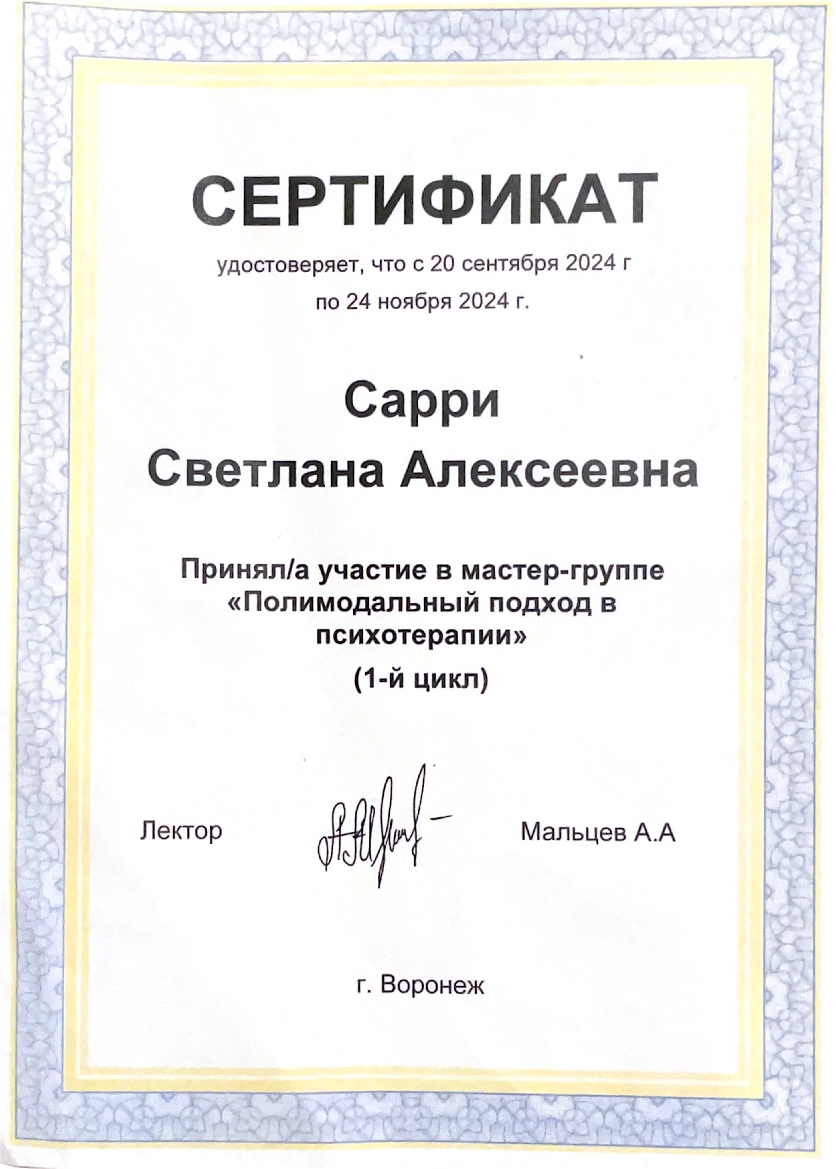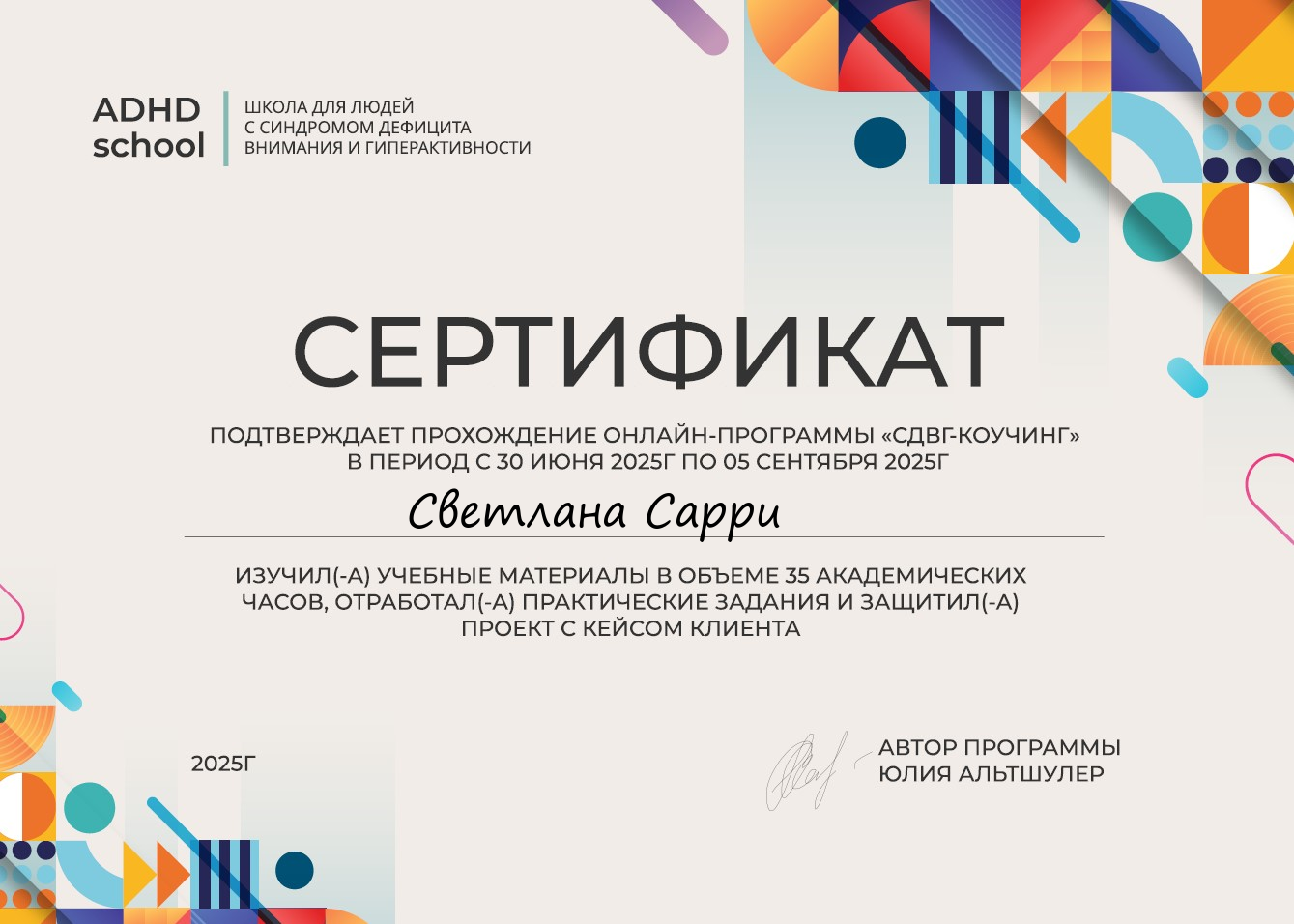Работаю в полимодальном подходе, владею приемами эмоционально-образной терапии. Являюсь сертифицированным СДВГ-коучем, понимаю трудности людей с нейроотличиями.